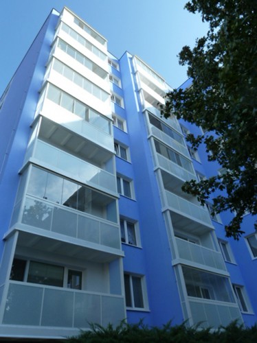 The AluVista frameless glazing system is a sliding and revolving glazing system without vertical aluminium dividing frames. Leaves made of transparent safety glass slide along a bottom rail at the railing height and are guided by a top rail of the same shape (does not interfere with the loggia or balcony interior). Water drainage is provided via drain holes. Special sealing between the leaves and side enclosing profiles guarantees almost perfect tightness of the structure. Vent holes ensure permanent and natural air exchange. The opening method enables safe and comfortable washing. The AluVista system can be complemented with convenient shading by window blinds.